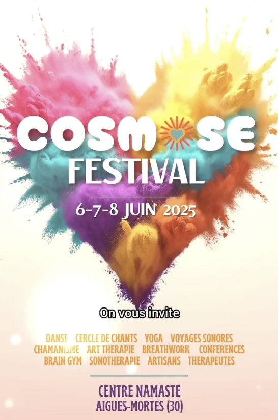 Les 5, 6 et 7 juin 2026, nous sommes heureux de vous retrouver au COSM✺SE Festival pour cette seconde édition qui s’annonce forte et pétillante ! Nous te proposons 2 journées et 2 soirées très riches en relaxation, joie, magie et partage.Une 20aine d’ intervenants et autant de disciplines originales, ressourçantes et enrichissantes.2 journées pour te retrouver, te connecter, partager, découvrir, rire.Le tout dans un environnement privilégié en pleine nature autour de 7 espaces : 2 studios, un préau, une yourte, piscine, jardins et pinède. Possibilité d'acheter un billet pour une seule journée mais attention en une journée tu ne pourras pas tout expérimenter donc prévois 2 jours si tu veux découvrir un maximum de disciplines. Nous avons fait le choix d'ouvrir cet espace uniquement pour les personnes majeures. Appartement de 3-4 à 5-6 personnes à partager entre amis.Pour bénéficier de la remise spéciale festival utilise le code promo : COSMOSE. Il est aussi possible de camper sur place en tente, van ou camion au prix de 5€/ emplacement. On a hâte de vous retrouver !