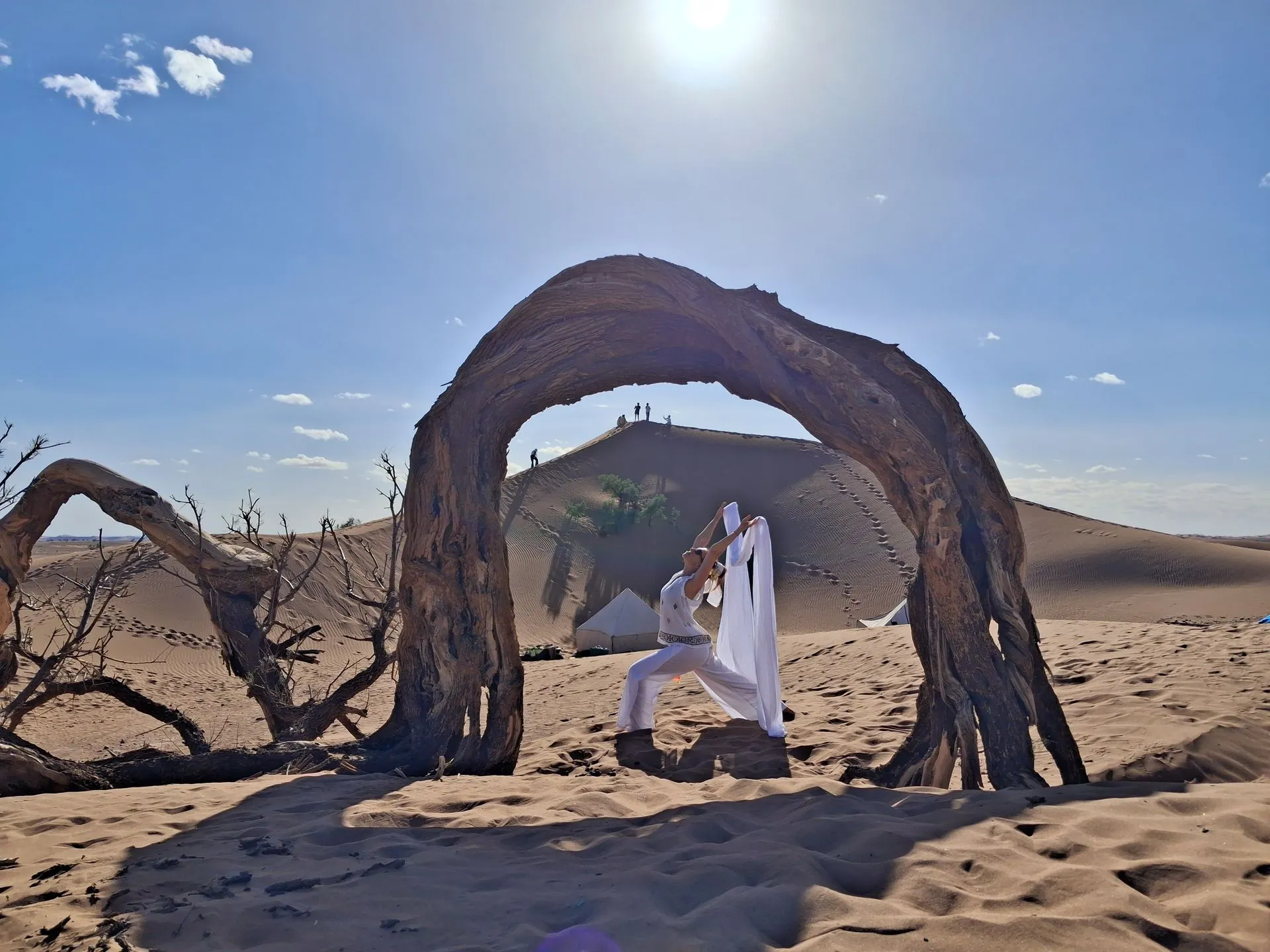 Ce séjour combine la marche et la pratique du yoga dans le désert du Draa. Tu marches environ trois heures par jour au rythme d'une caravane de dromadaires à travers les dunes. Les journées intègrent des séances de yoga Hatha et Ashtanga accessibles aux débutants, ainsi que des temps de méditation. L'expérience propose des nuits en riad à Marrakech et en bivouac nomade sous tente ou à la belle étoile. Au fil de la semaine, tu découvres la culture locale et partages des moments collectifs autour du feu. Le programme inclut aussi la visite de sites comme la Kasbah Aït Ben Haddou.