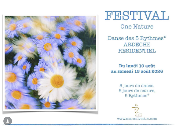 5 Jours de danse, 5 jours de nature, 5 Rythmes. Avec Marc Silvestre - Irene H. Sanchez - Sara Cereghetti - Shanti Park - Galina Turmine - Nessim Bismuth. Des studios de danse pour approfondir, un espace de danse en extérieur, des profs venus d’Europe, un musicien live, une nourriture bio et locale faite sur place, de la chambre individuelle à la place de camping, un séjour que l’on veut unique et ouvert au plus grand nombre. Ce festival vous accueille pour danser bien sûr, et aussi pour profiter d’une nature exceptionnelle au cœur de l’Ardèche sauvage, avec forêt, lac pour se baigner, toutes les commodités pour rendre ces journées les plus nourrissantes et apaisantes possibles. Un programme : Réveil corporel avant le petit déjeuner, danse le matin en studio ou extérieur suivant la météo, une vague en fin de journée et des surprises tout au long de la semaine. Ce festival est sans drogue et sans alcool.