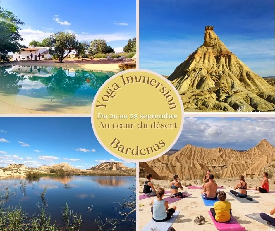Ce stage propose une immersion entre yoga et marche au cœur du désert des Bardenas. Tu pratiques le Hatha et l'Ashtanga yoga lors de séances quotidiennes adaptées à ton niveau. Le programme inclut des marches méditatives et silencieuses à travers les reliefs rocheux pour travailler l'ancrage. Des exercices de respiration et des bains sonores complètent l'expérience pour favoriser la détente physique. L'hacienda dispose d'une piscine naturelle pour les temps de repos. Les repas végétariens soutiennent la pratique tout au long du week-end.
