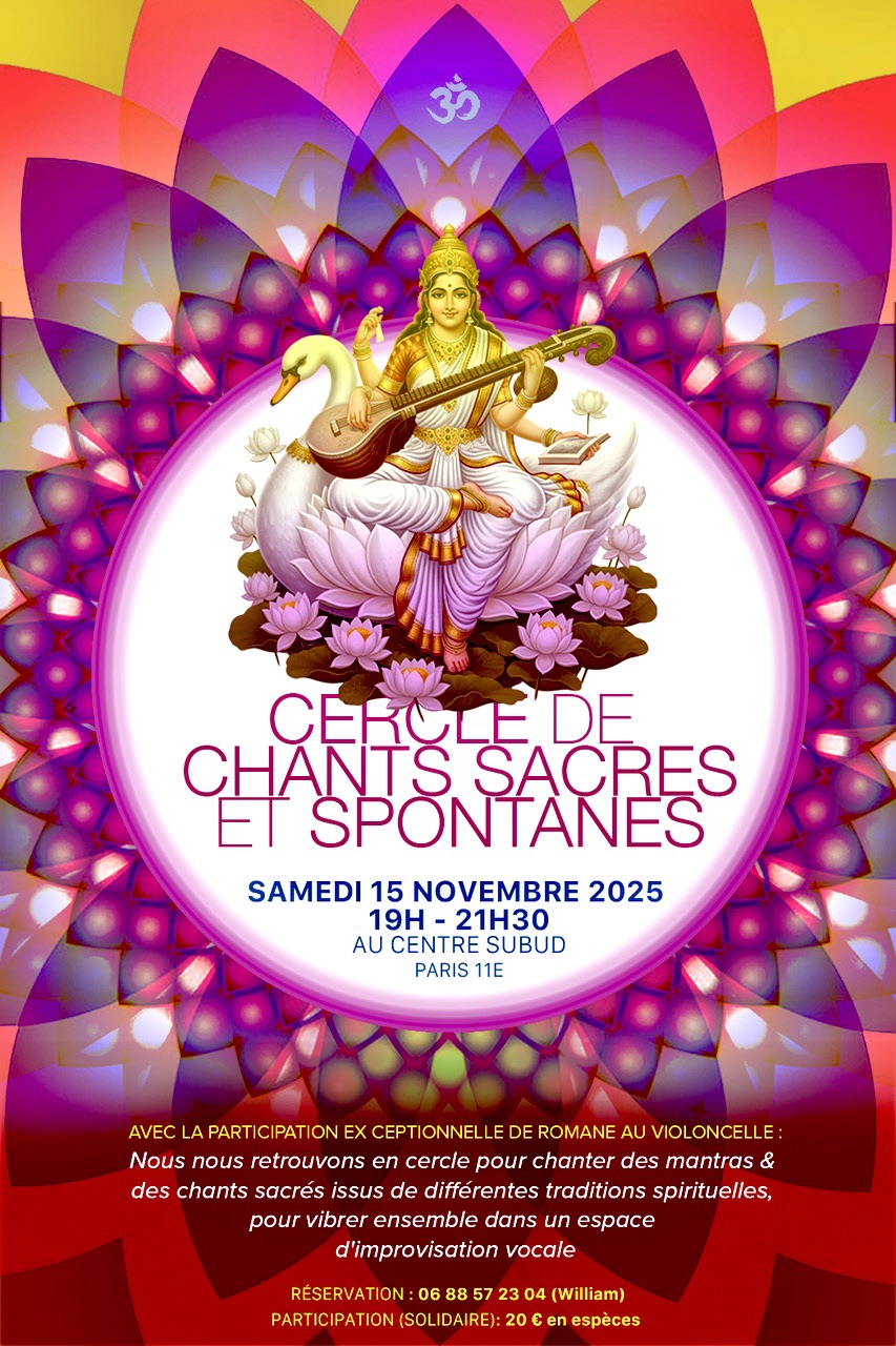 đGuidĂ©s par les mantras sacrĂ©s dâInde et par les chants sacrĂ©s dâAmĂ©rique du Sud, nous explorerons notre vibration collective lors de cette soirĂ©e mĂ©ditative et joyeuse. Lâoccasion dâexpĂ©rimenter lâouverture du chakra de la gorge, dâactiver nos cĆurs, et de cĂ©lĂ©brer la joie dâĂȘtre ensemble. đ¶Ce cercle sera guidĂ© par les musiciens Akhil et William, Ă la guitare, au clavier et aux percussions. Nous aurons la joie dâĂȘtre accompagnĂ©s de Romane avec son violoncelle, qui proposera aussi quelques chants. Les livrets de chants vous seront distribuĂ©s lors de lâaccueil. đȘ¶Inscriptions par message au 0688572304 auprĂšs de William. â©Au Centre SUBUD, 6 rue Deguerry, Paris 11 (Metro Couronne ou Parmentier), de 19h Ă 21h30 đParticipation 20 euros đ HĂąte de vous accueillir pour cette merveilleuse soirĂ©e ! Shanti Om ! đđđȘ¶âš