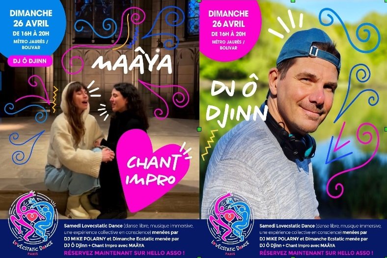 CHANT IMPRO & ECSTATIC DANCE MAÂYA propose une exploration individuelle et collective pour libérer nos voix. Suivie par une Ecstatic Dance mixée par Dj Ô Djinn instagram MAÂYA : @maaya.singingcircle soundcloud Ô Djinn : Vocal Lab avec le collectif @maaya.singingcircle c'est une exploration individuelle et collective pour libérer nos voix. Avec des exercices simples et accessibles à tous les niveaux, tu rentreras dans un voyage où toutes les voix se complètent, s'harmonisent et se soutiennent. Un temps de rencontre à soi et au groupe par le chant avant de laisser place au mouvement ecstatique ! Tu pourras suivre ton Flow sur les vagues de Bass Music ,de Dub et de Techno Minimal mixées par Dj Ô Djinn . Dimanche 26/04/2026 de 16h à 19h Prix 30e inscription :
